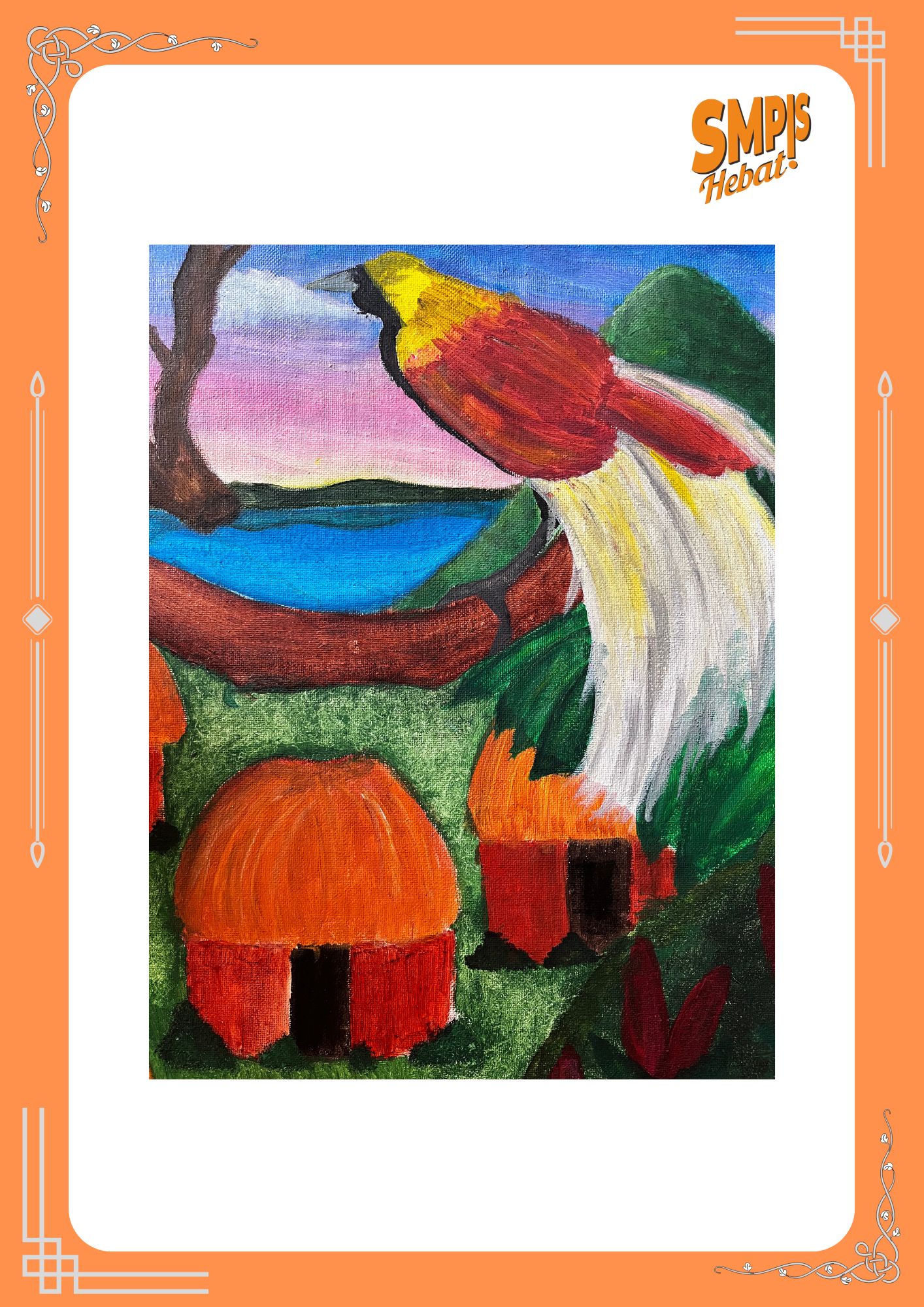 Lukisan ini menggambarkan seekor burung cendrawasih dengan ekor panjang berwarna putih yang indah. Burung tersebut tampak berada di lingkungan alam yang hijau dan asri. Di bagian bawah lukisan terlihat rumah-rumah sederhana dengan atap jerami yang mencerminkan suasana pedesaan. Latar belakang langit berwarna biru dan merah muda menampilkan suasana pagi atau sore hari. Sungai kecil dan pepohonan menambah kesan alami pada lukisan ini. Warna-warna yang digunakan terlihat lembut namun tetap hidup. Lukisan ini menggambarkan keharmonisan antara manusia dan alam. Pesan yang disampaikan adalah pentingnya hidup selaras dengan lingkungan. Karya ini cocok sebagai media edukasi visual bagi siswa.