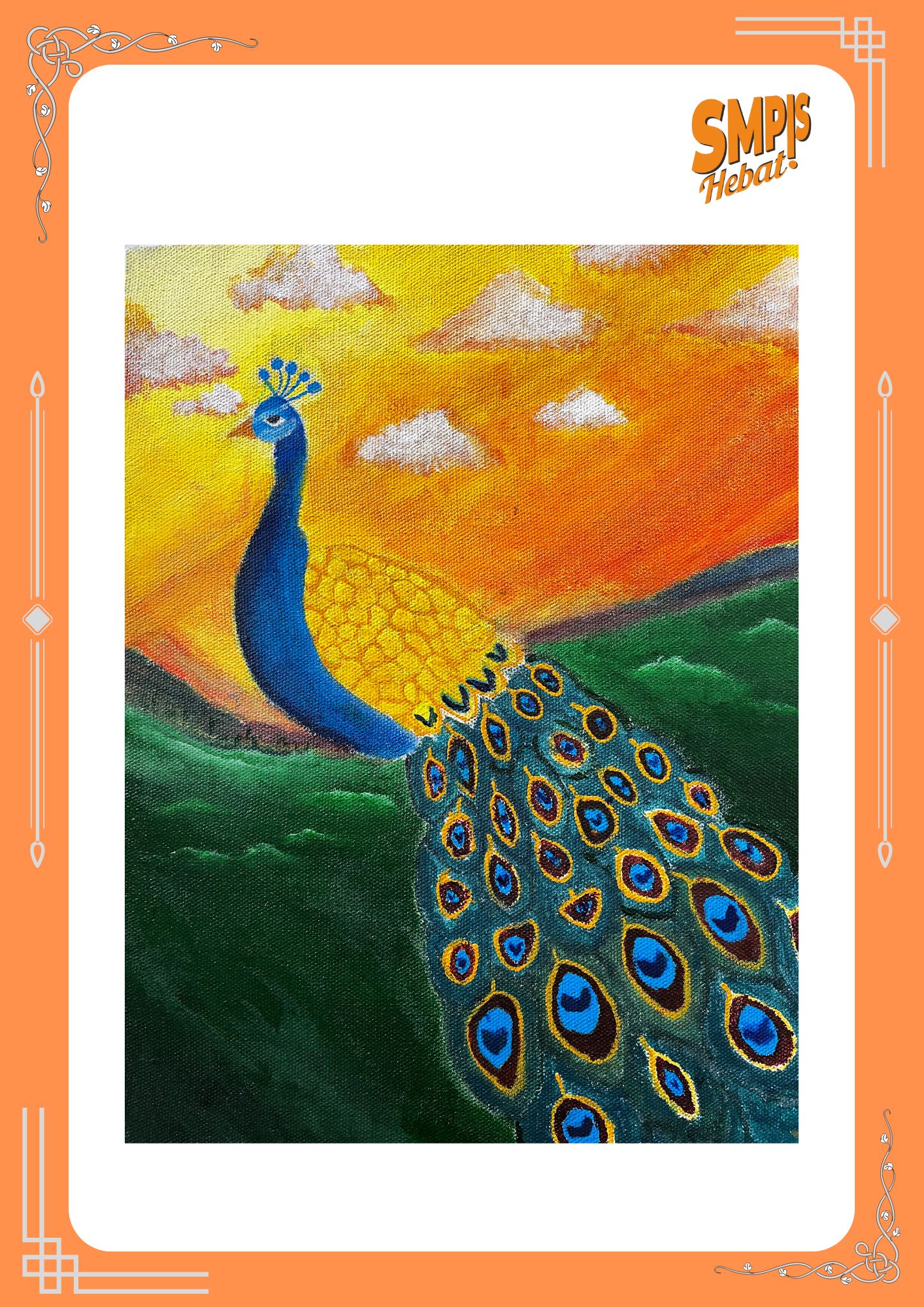 Lukisan ini menggambarkan seekor burung merak dengan bulu indah yang penuh warna. Merak digambar berdiri anggun dengan ekor bermotif khas yang menarik perhatian. Latar belakang berupa perbukitan hijau dan langit jingga memberi kesan suasana sore hari. Warna kuning dan oranye pada langit menciptakan nuansa hangat dan tenang. Komposisi lukisan terlihat sederhana namun kuat secara visual. Detail bulu merak dibuat rapi dan berulang sehingga tampak teratur. Lukisan ini menunjukkan keindahan satwa dan alam secara bersamaan. Pesan yang disampaikan adalah rasa bangga terhadap keindahan ciptaan Tuhan.