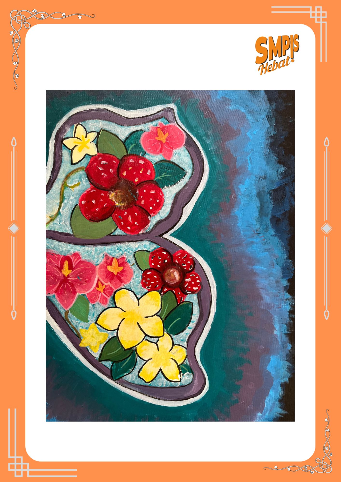 Lukisan ini menampilkan berbagai jenis bunga dengan warna yang cerah dan menarik. Bunga merah, kuning, dan merah muda terlihat tersusun rapi di dalam bentuk bingkai yang unik. Setiap bunga digambar dengan bentuk sederhana namun jelas. Daun-daun hijau melengkapi keindahan bunga dan memberi kesan segar. Latar belakang berwarna biru kehijauan membuat objek bunga semakin menonjol. Perpaduan warna terlihat harmonis dan enak dipandang. Lukisan ini menunjukkan keberanian dalam memadukan warna kontras. Karya ini mencerminkan kecintaan terhadap keindahan alam. Melalui lukisan ini, siswa mengekspresikan kreativitas dan imajinasinya dengan baik.