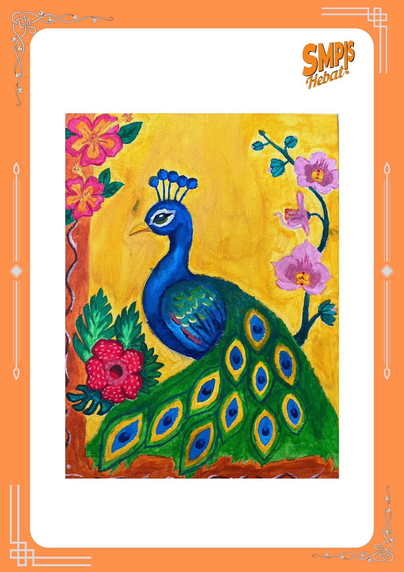 Lukisan ini menampilkan seekor burung merak dengan bulu ekor yang indah dan berwarna-warni. Warna hijau, biru, dan kuning mendominasi bagian tubuh dan ekor burung. Latar belakang berwarna kuning cerah membuat burung merak terlihat semakin menonjol. Di sekitar burung terdapat hiasan bunga yang menambah keindahan lukisan. Bentuk burung digambar dengan jelas dan proporsional. Motif mata pada bulu ekor digambar berulang dengan rapi. Lukisan ini menunjukkan keindahan satwa dengan cara yang kreatif. Karya ini mencerminkan ketelitian dan kesabaran dalam proses melukis. Melalui lukisan ini, siswa menampilkan pesona alam dalam bentuk seni.