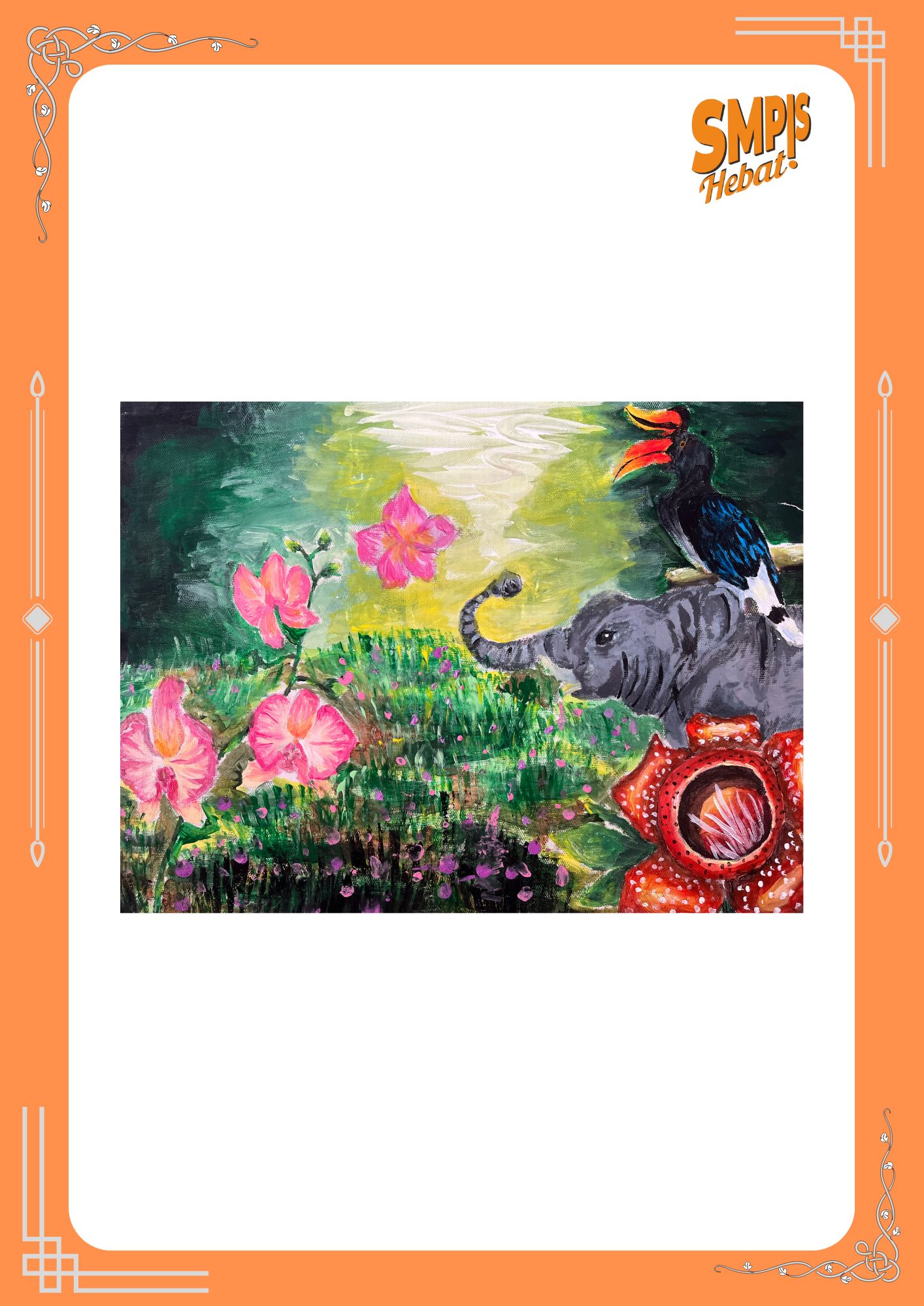 Lukisan ini menggambarkan suasana alam yang penuh kehidupan dan warna. Terlihat seekor gajah dengan belalainya terangkat, didampingi seekor burung yang bertengger di punggungnya. Di sekelilingnya terdapat bunga-bunga berwarna merah muda yang sedang bermekaran. Rumput hijau dan latar belakang berwarna cerah memberikan kesan subur dan segar. Perpaduan hewan dan tumbuhan menunjukkan keharmonisan alam. Warna yang digunakan tampak berani dan ekspresif. Lukisan ini menghadirkan suasana damai dan hangat. Objek digambar dengan gaya sederhana namun penuh makna. Karya ini mengajak kita untuk menjaga kelestarian alam dan makhluk hidup di dalamnya.