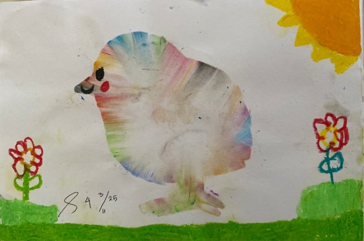 Karya seni usap abur ini menampilkan eksplorasi warna yang lembut dan menyatu secara alami. Ananda mengusap dan mengaburkan berbagai warna hingga membentuk objek menyerupai hewan dengan gradasi yang halus. Perpaduan warna pastel menciptakan kesan dinamis dan ekspresif, seolah warna bergerak mengikuti imajinasi anak. Tambahan elemen lingkungan seperti rumput, bunga, dan matahari memperkaya cerita visual dalam karya ini. Melalui teknik usap abur, ananda belajar mengontrol tekanan tangan, mengenal perpaduan warna, serta mengekspresikan ide secara bebas. Karya ini mencerminkan kreativitas, keberanian bereksperimen, dan kepekaan artistik anak dalam menciptakan gambar yang unik dan penuh makna.